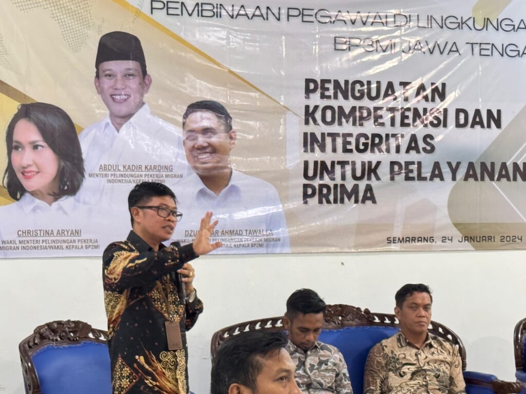 Semarang, Kementrian P2MI(24/1) – Biro Organisasi dan SDM Kementrian Pelindungan Pekerja Migran Indonesia /BP2MI melakukan kunjungan ke kantor Balai Pelayanan Pelindungan Pekerja Migran Indonesia (BP3MI) Jawa Tengah dalam rangka Penguatan Kompetensi dan Integritas untuk Pelayanan Prima di Lingkungan BP3MI Jawa Tengah. Kegiatan berlangsung secara luring dan Daring diikuti seluruh Pegawai di lingkungan BP3MI Jawa Tengah.